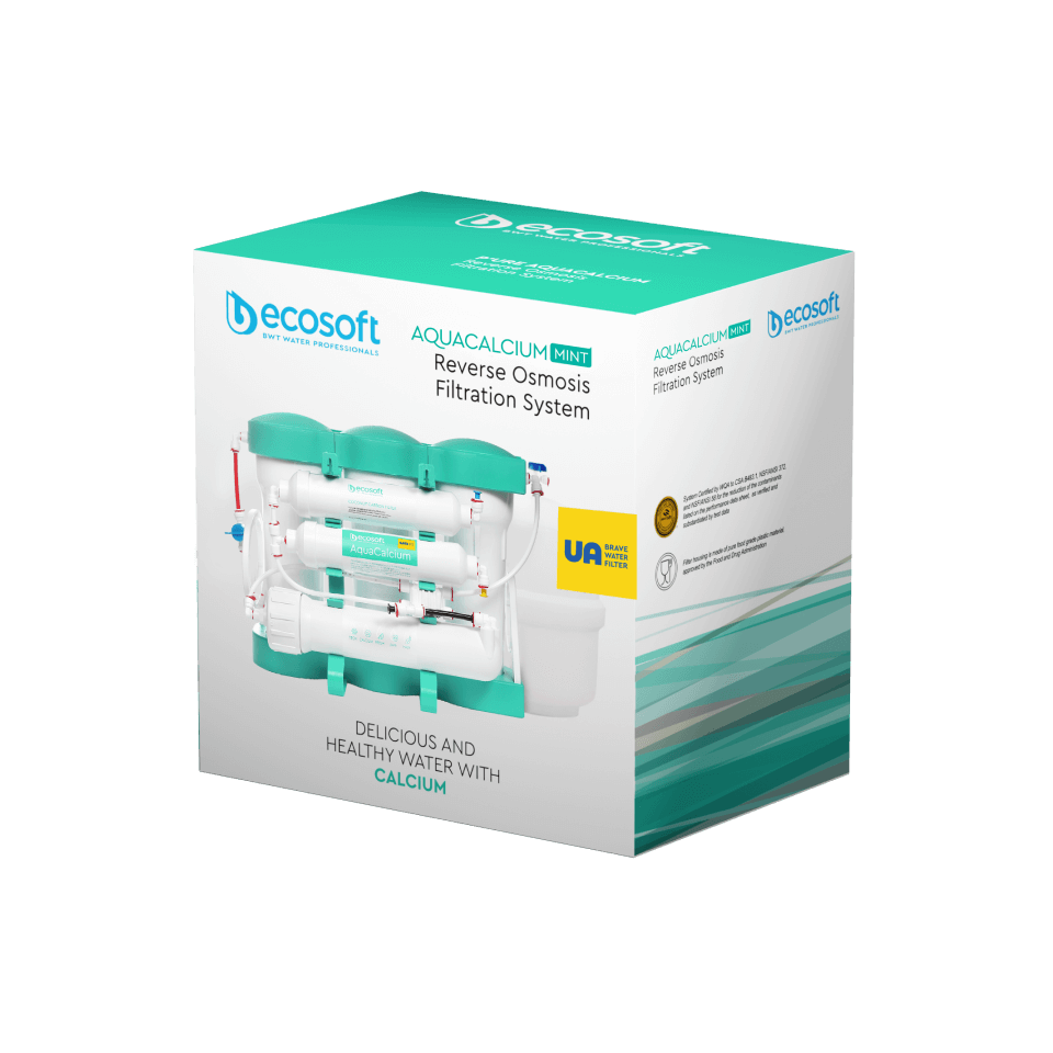 Ecosoft AquaCalcium MINT este o combinatie dintre tehnologia de purificare prin membrana de osmoza inversa (0.0001 microni) de 75 GPD, cartuse pre si post filtrare cu dublu carbune activat, dar si un cartus special pentru remineralizarea apei filtrate cu imbogatire cu calciu. Acest sistem este diferit de toate celelalte deoarece are o eficienta ridicata a membranei de osmoza. Eficienta membranei ajunge pana la 50%.